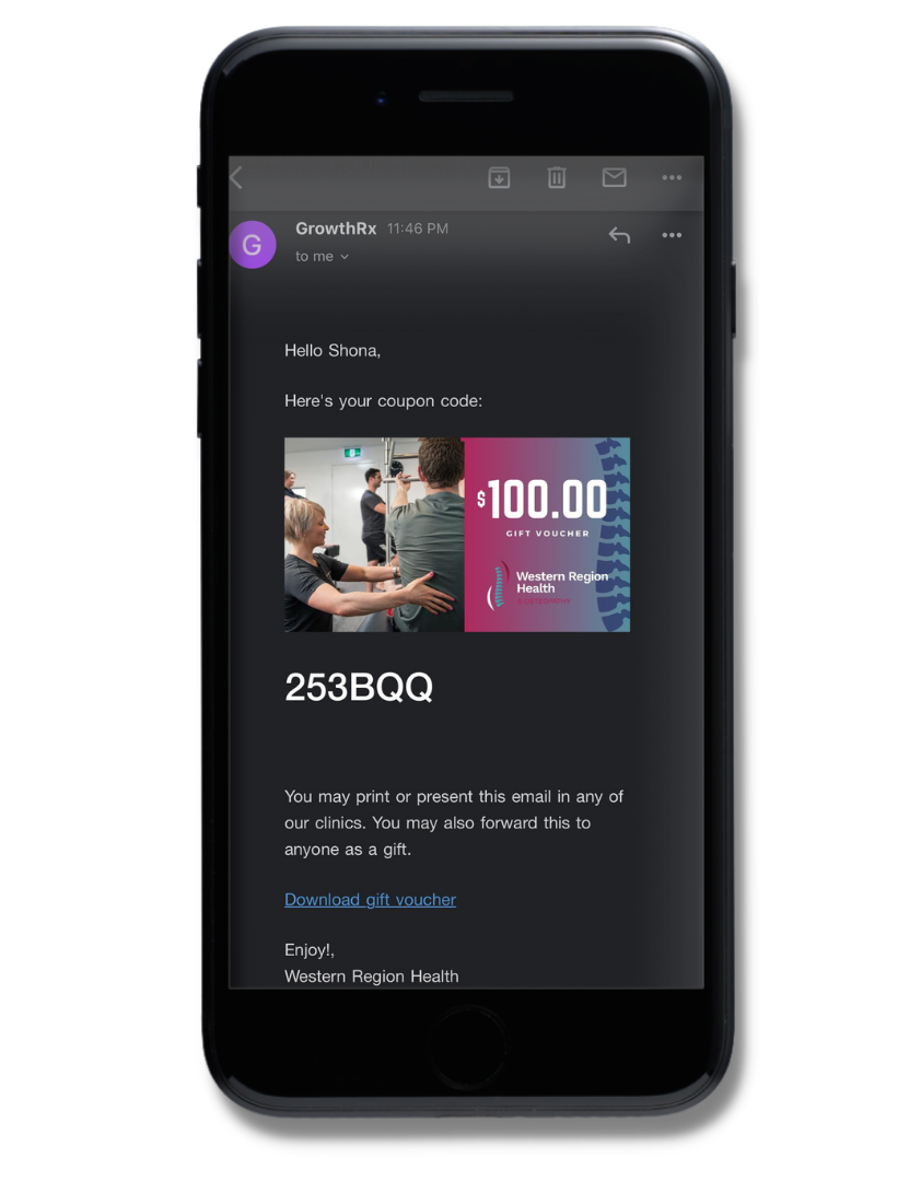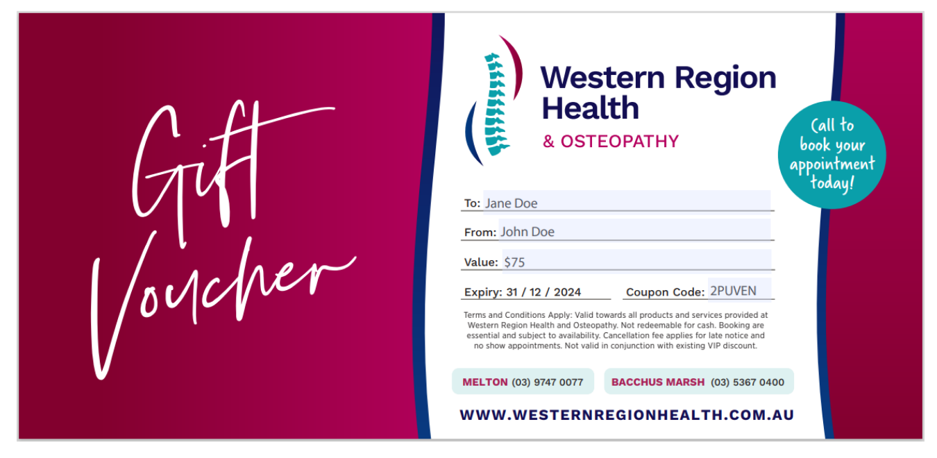 Download the gift voucher, enter the coupon code and print it out.